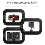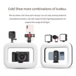 This LED ring light also includes a built-in smartphone mount, three accessory shoe ports for microphones or additional lights, and a ¼″ thread for mounting on tripods or stands, making it a flexible tool for content creation, social media capturing, and professional lighting setups.